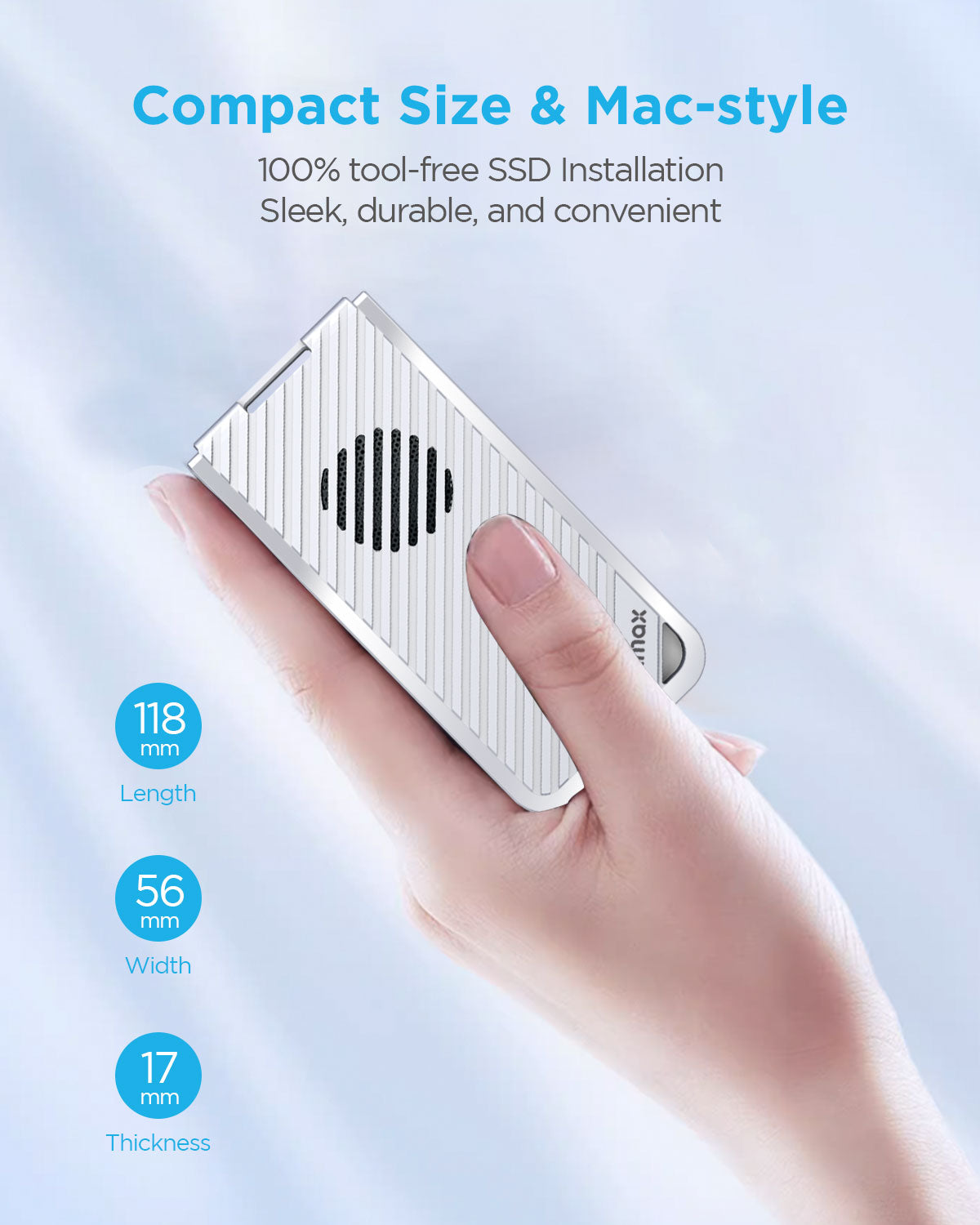 100% tool-free installation of SSD, compact and portable, plug and play, no driver required.