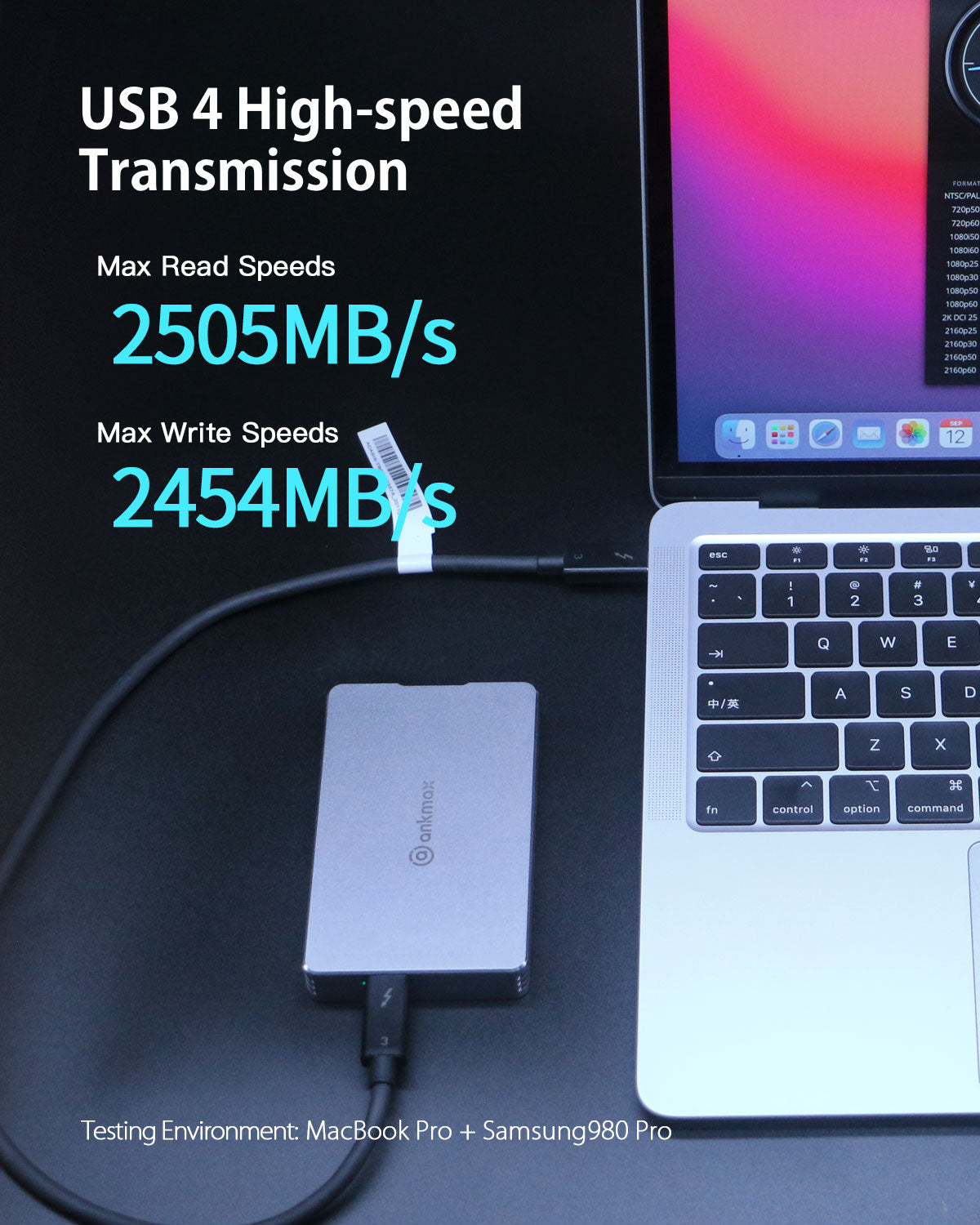 · Elevate your storage tasks to ultimate heights on PCs and Macs with ANKMAX's fastest-ever portable USB4 enclosure with NVMe SSD. Designed with a USB 4 port that delivers up to 40 Gb/s, supports cross-platform operating systems such as Windows /Mac /Linux/iPad Pro.